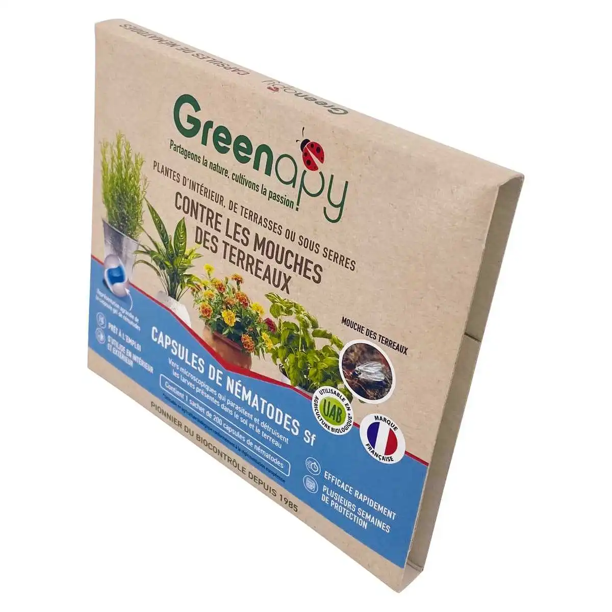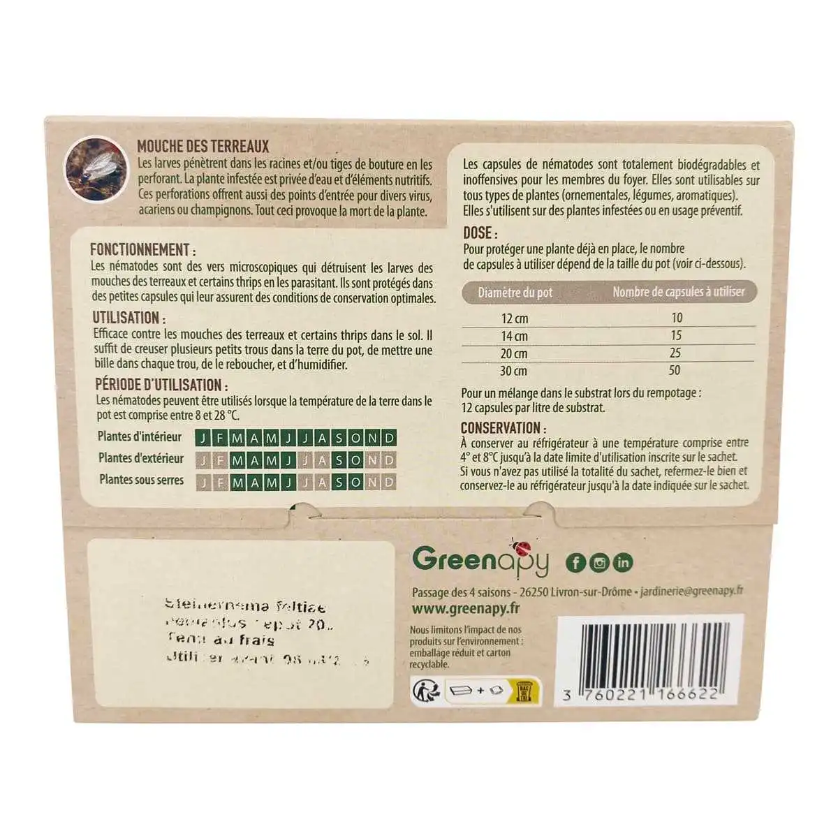 Les nématodes sont conditionnés dans des sachets de 200 capsules. Un sachet protège donc 20 pots de diamètre 12 cm ou 8 pots de diamètre 20 cm.