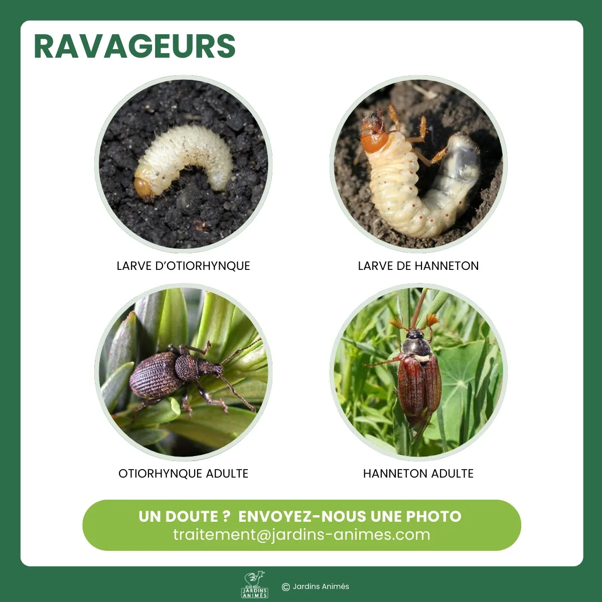 | 📅Période de traitement | Otiorrhynques : de mars à mai puis d'août à octobre. Hannetons : de mai à septembre. |