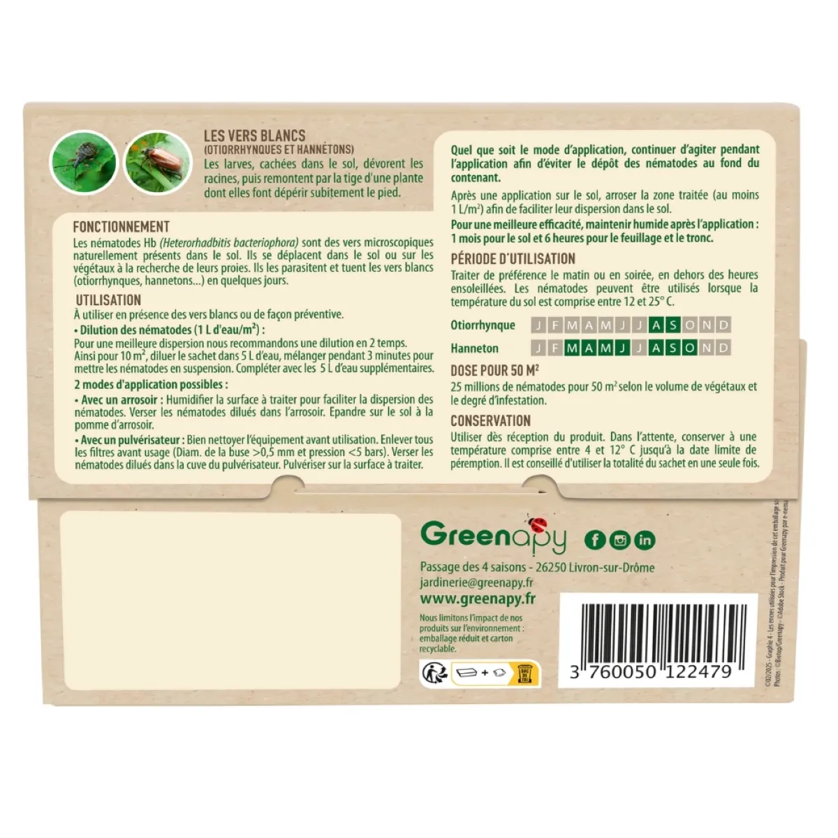 | 🐛Ravageurs ciblés | Vers blancs, larves et nymphes d'otiorhynques (charançon de la vigne, poinçonneur des lilas), larves de hannetons. |