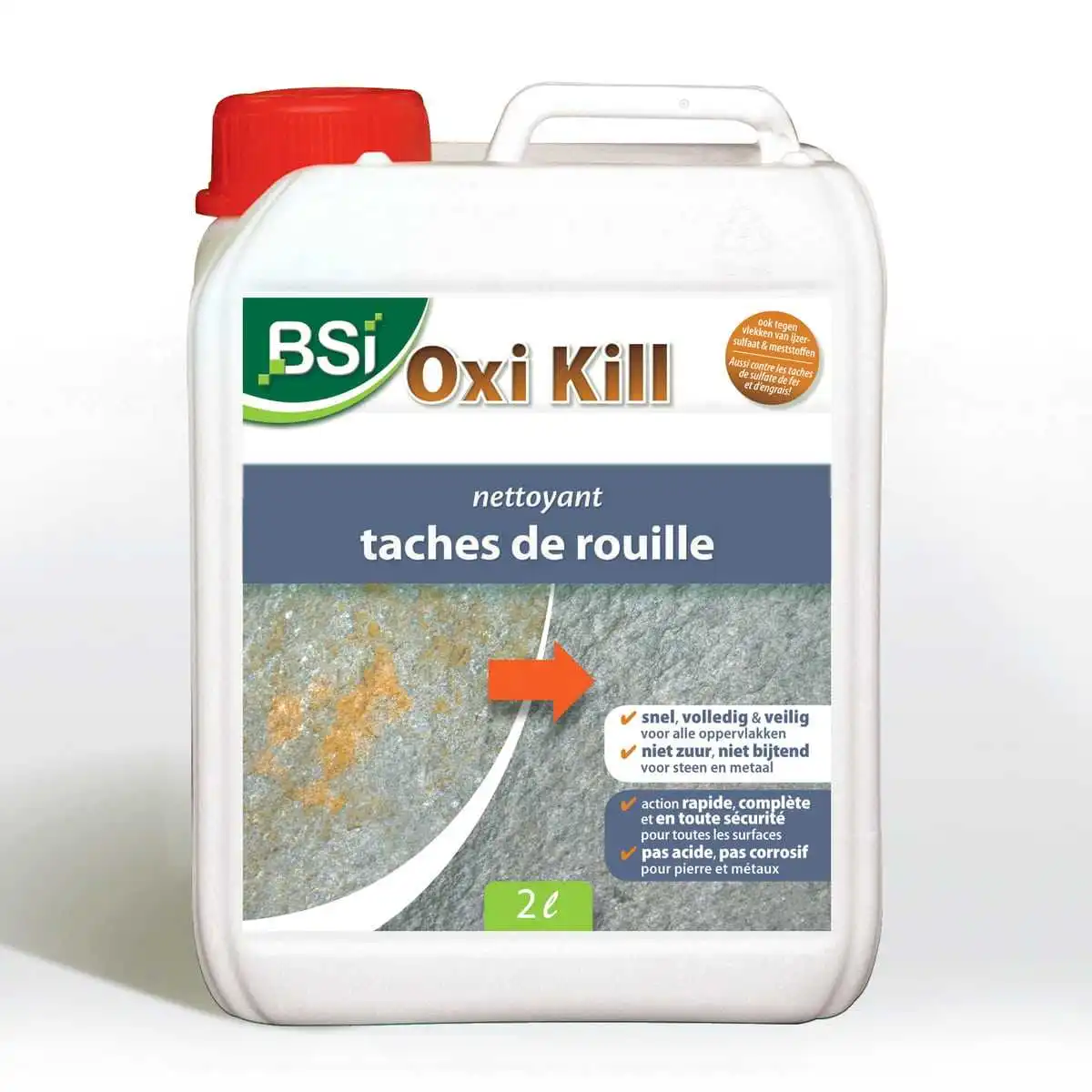 Nettoyant tache de rouille Oxi Kill Efficacité du produit insuffisante. 2 l pour nettoyer 4m2 de terrasse souillée par du sulfate de fer, le résultat est très insuffisant. Je vais essayer avec un autre produit, peut être aussi inefficace mais mois cher