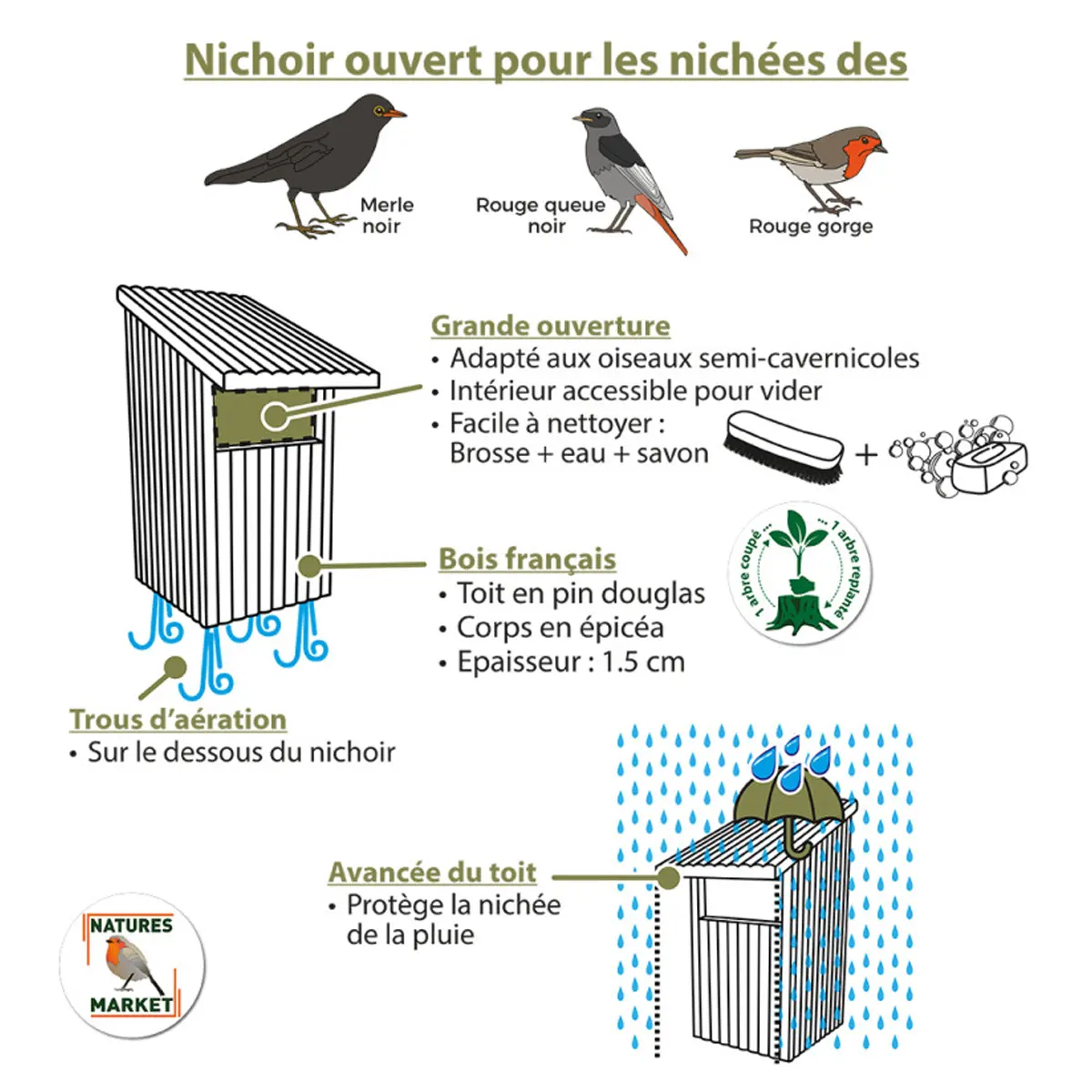 Ce nichoir a été spécialement conçu pour les oiseaux semi-cavernicoles, grâce à sa large ouverture sur l'extérieur. Il est ainsi parfaitement adapté à des espèces comme le rouge-gorge, le rouge-queue noir et le merle.