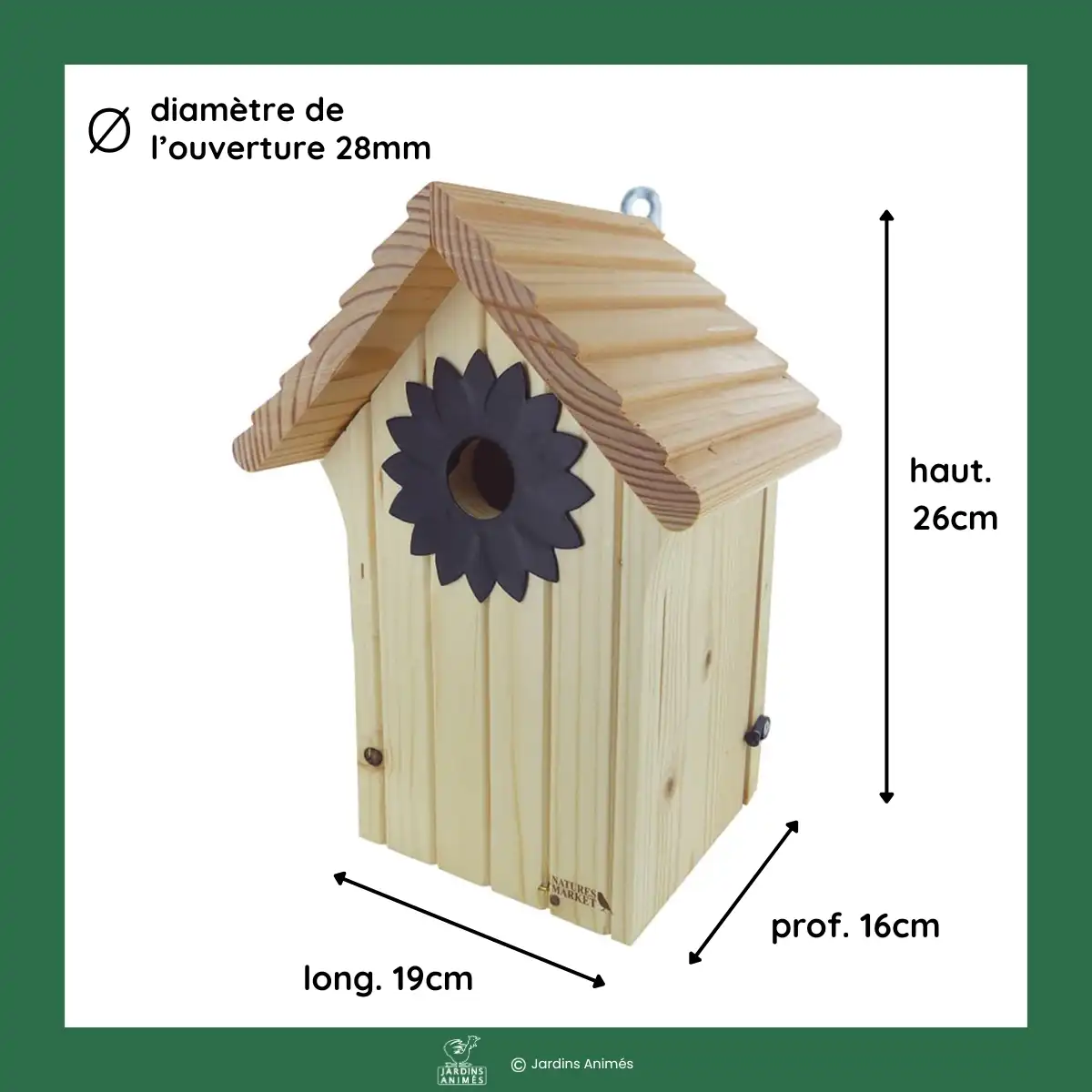 Ses dimensions et ses finitions ont été étudiées pour le bien être des oiseaux et pas seulement pour son côté déco... Le diamètre de l'entrée mais aussi la hauteur du nichoir sont par exemple des éléments essentiels pour que la mésange puisse y établir son nid et accueillir ses oisillons.