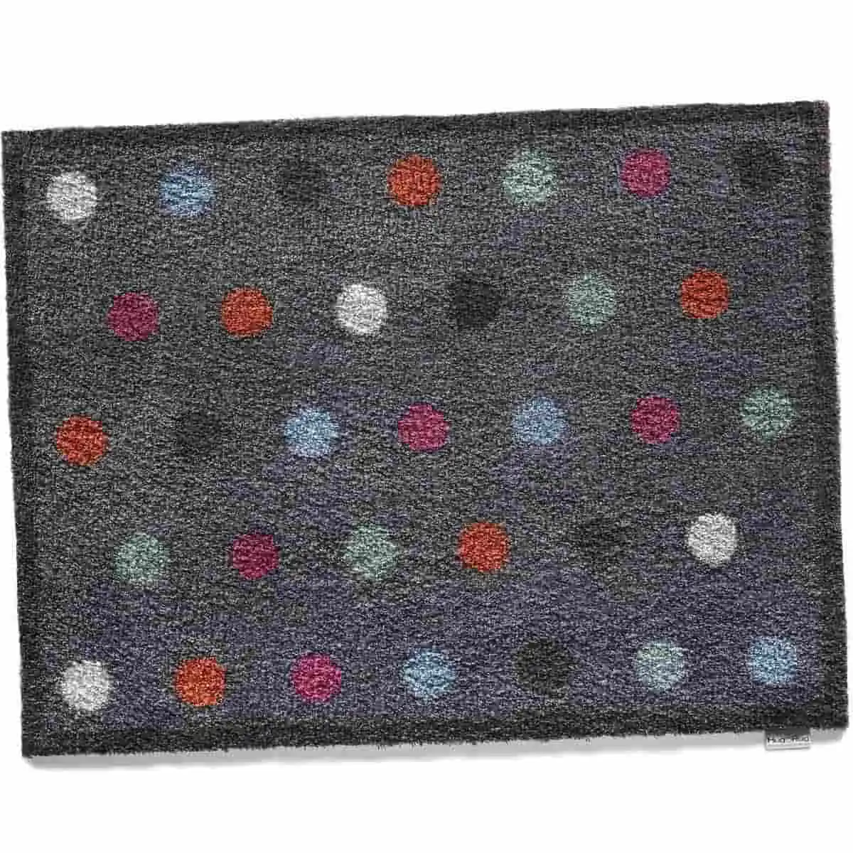 Paiements sécurisés Dim. 65x85cm - tapis au motif à points multicolore sur fond gris.