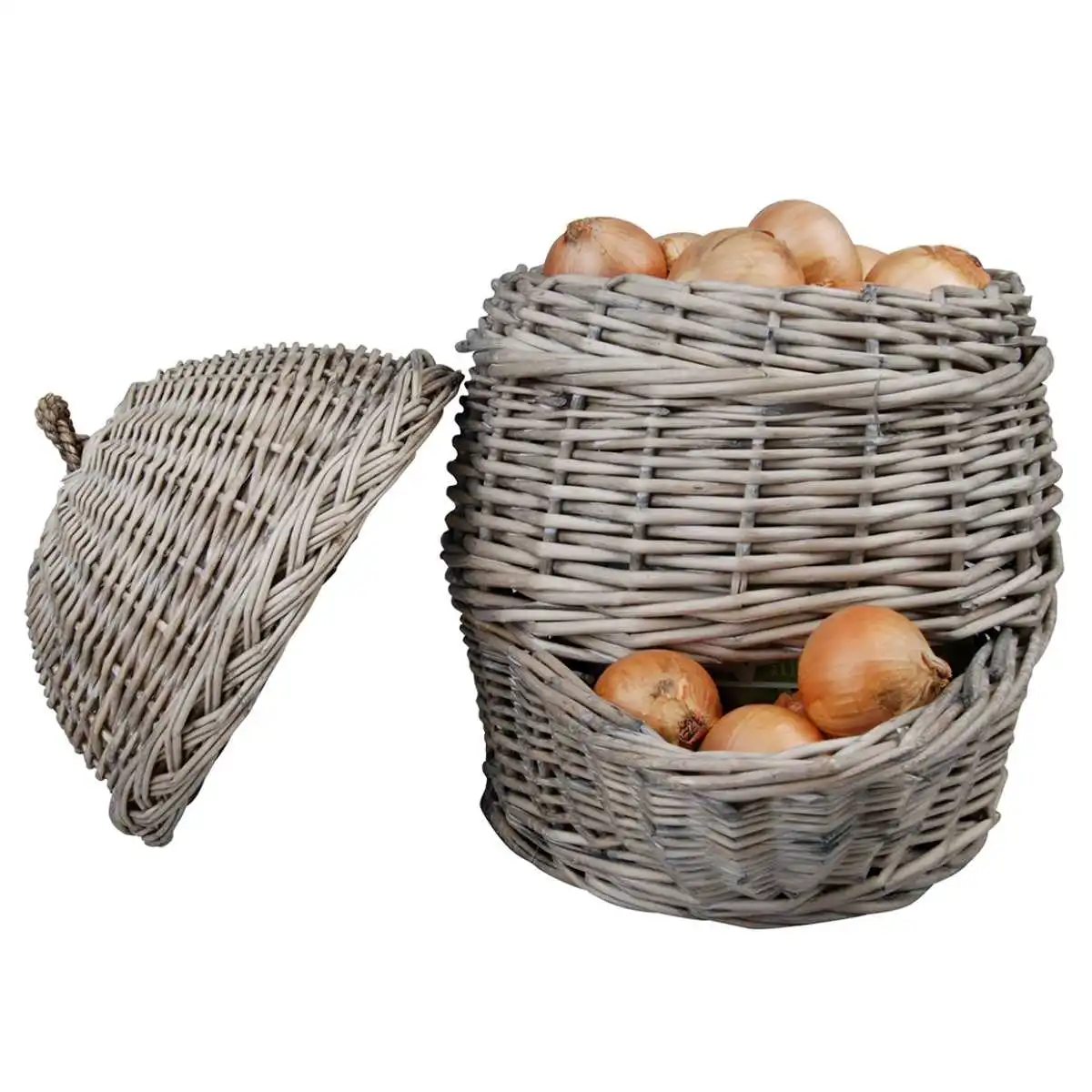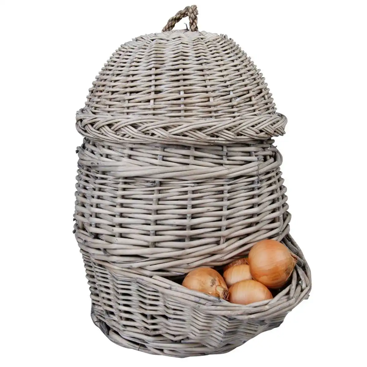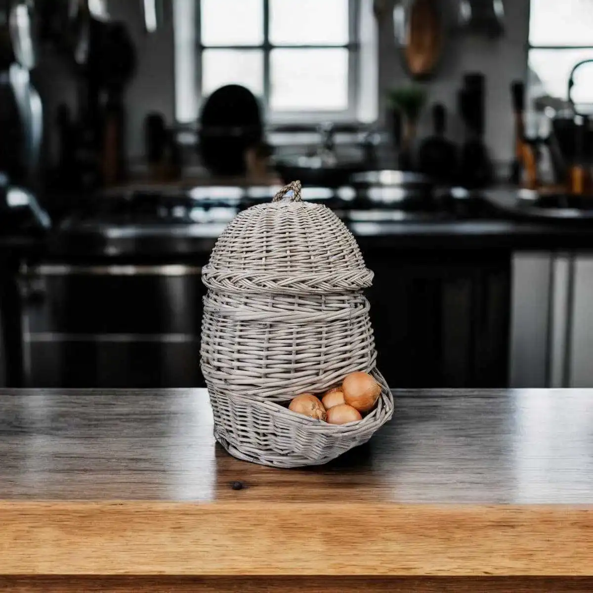 Voilà un panier en osier idéal pour maintenir vos oignons au sec et à l'ombre. Sa taille et sa contenance adaptée permettent d'accueillir une quantité raisonnable de légumes tout en optimisant l'espace dans votre cuisine.