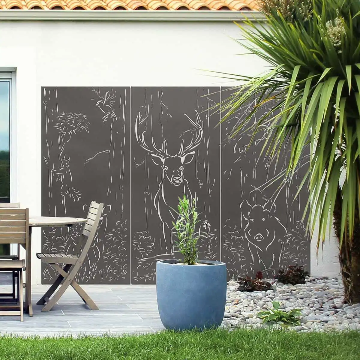Panneaux décoratifs en métal L.240 x H.180cm Gris - Scène foret - lot de 3 Magnifique pare vue . Très contente de mon achat. Facile à installer. Livraison en 10 jours. Je recommande ce site