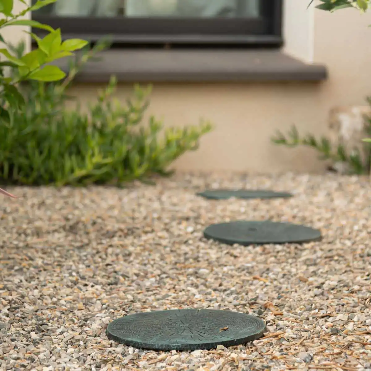 Posez ensuite vos dalles en fonte à même le sol, vous n'avez pas besoin de creuser ou de bêcher votre terrain ! Essayez de créer un chemin pas trop uniforme et légèrement courbé pour donner un esprit zen et harmonieux à votre extérieur.