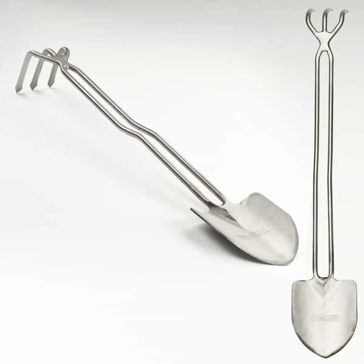 Deux en un ! Une combinaison astucieuse d'une pelle et d'un râteau à 3 dents, exploitant le même manche.