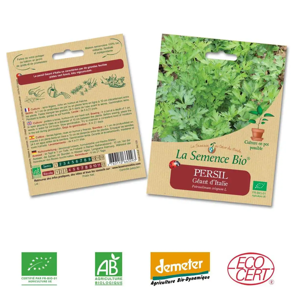Une qualité jusque dans l'emballage (entièrement recyclable) qui, grâce à son double conditionnement, garantit une durée de vie deux fois plus longue en préservant la qualité germinative des graines de persil.