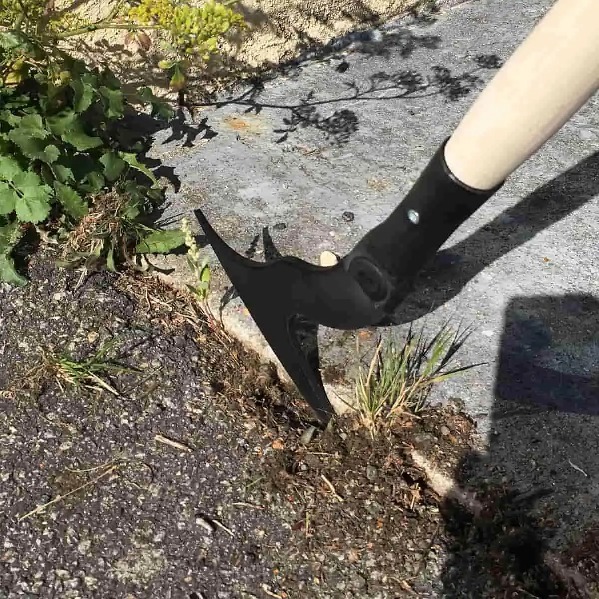 Son bout pointu permet d'aller chercher les racines coincées dans les interstices des pavés.