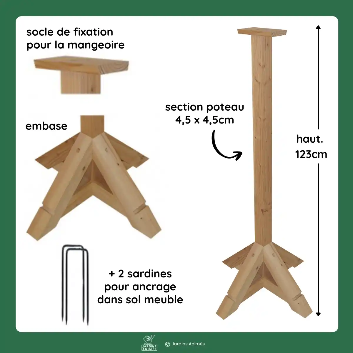 Une planche pré-percée intégrée au sommet facilite la fixation directe d'une mangeoire en bois. Ce poteau est parfaitement compatible avec plusieurs modèles de notre gamme, conçues avec un fond adapté à ce système de montage.