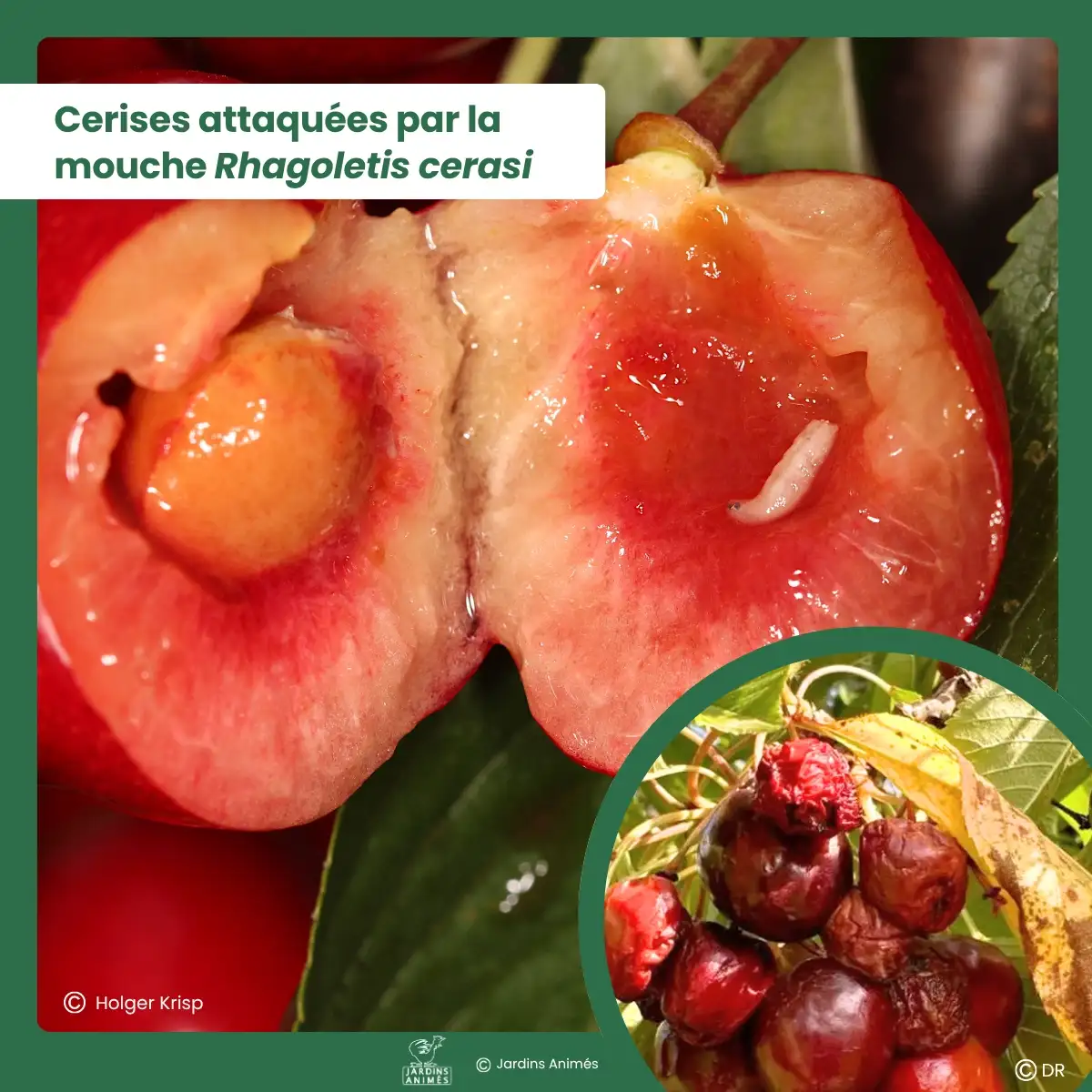 Le ver de la mouche Rhagoletis Cerasi se développe sur toutes les variétés de cerisiers. Les dégâts varient d'une année à l'autre mais sont plus importants lorsque les températures sont élevées en juin et juillet pendant la période de ponte. Les fruits attaqués présentent un petit asticot (désagréable en bouche) et finissent par pourrir.