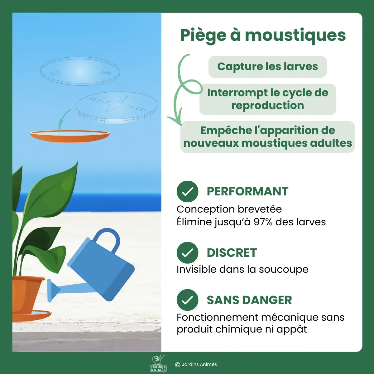 Conçu pour s'intégrer parfaitement dans les coupelles de pots de fleurs, il agit de manière discrète, autonome et redoutablement efficace, sans modifier l'esthétique de vos extérieurs.