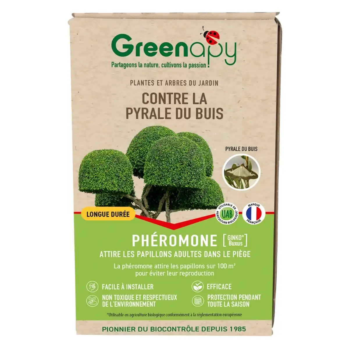 Produit très efficace. Permet de connaître l'apparition des papillons et ainsi d'intervenir rapidement pour soigner les buis. Je recommande fortement ce produit