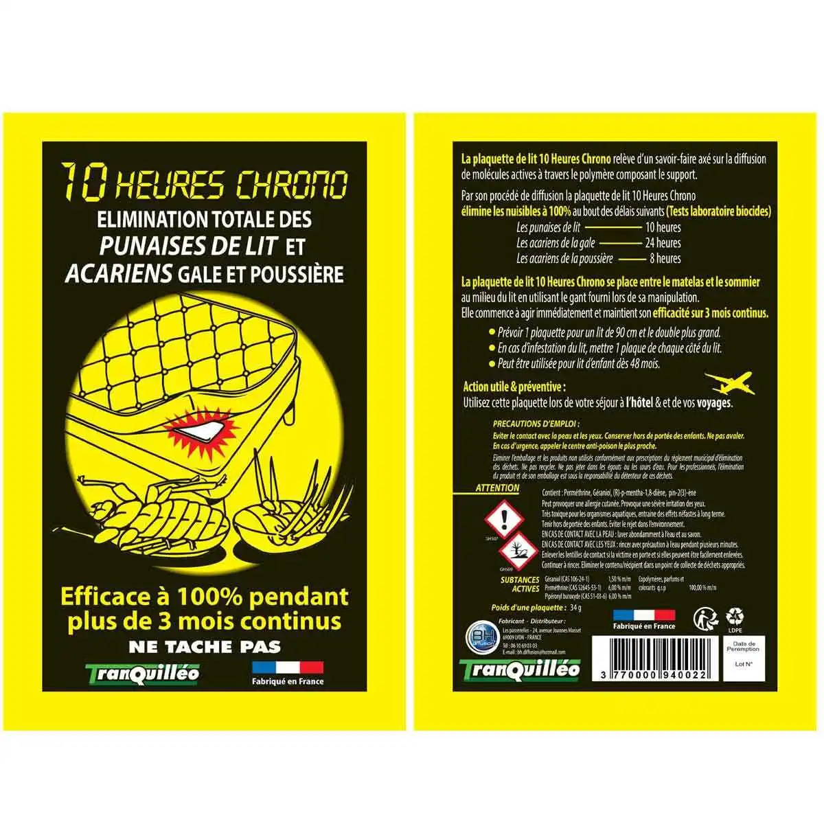 Nota bene : Malgré notre volonté de trouver des produits respectueux de l'environnement, ici nous faisons une exception. Le contenu des plaquettes 4h et 10h chrono n'est pas bio et naturel, mais elles constituent à l'heure actuelle une des seules solution efficace pour limiter l'infestation des punaises de lit représentant un véritable fléau et colonisant l'environnement très rapidement.