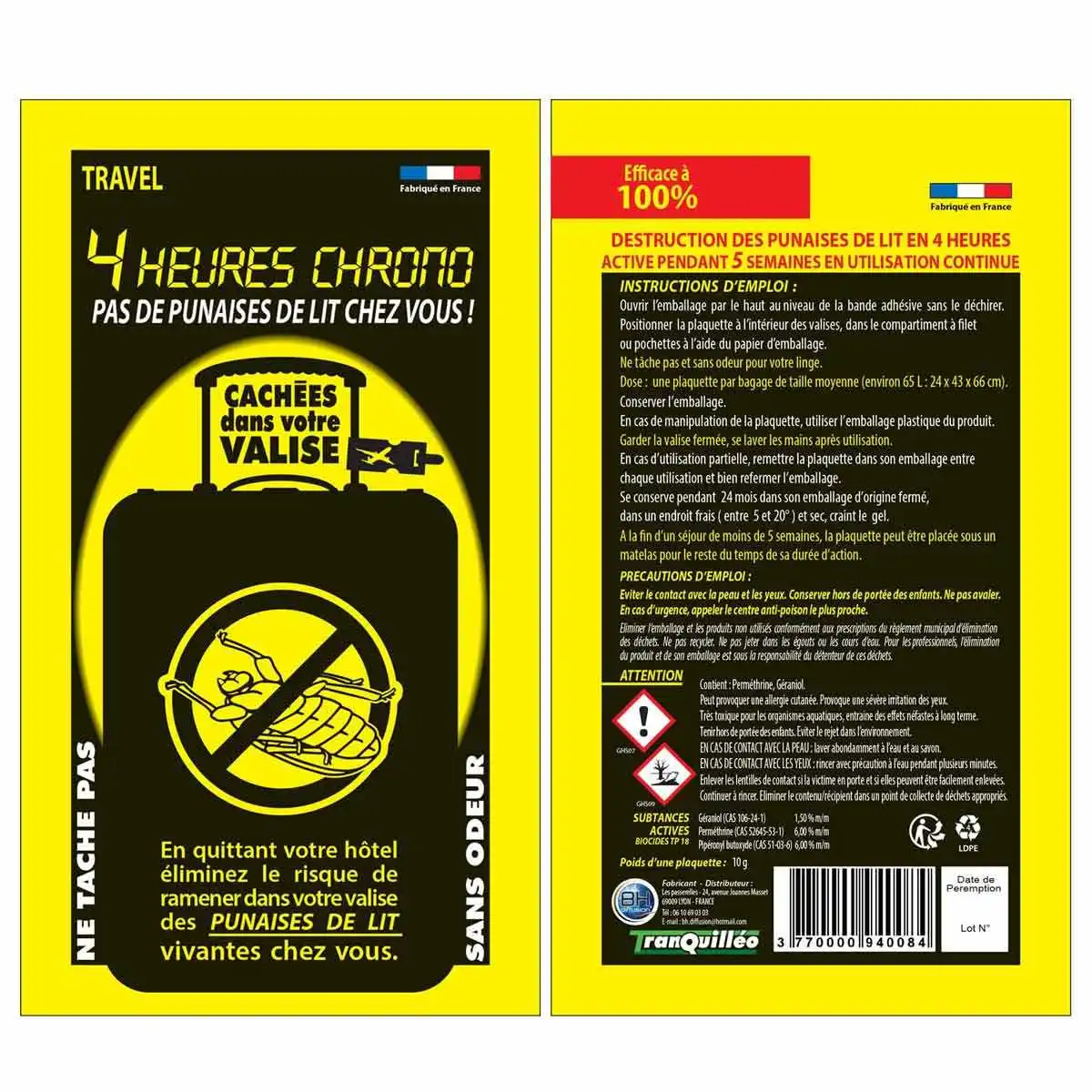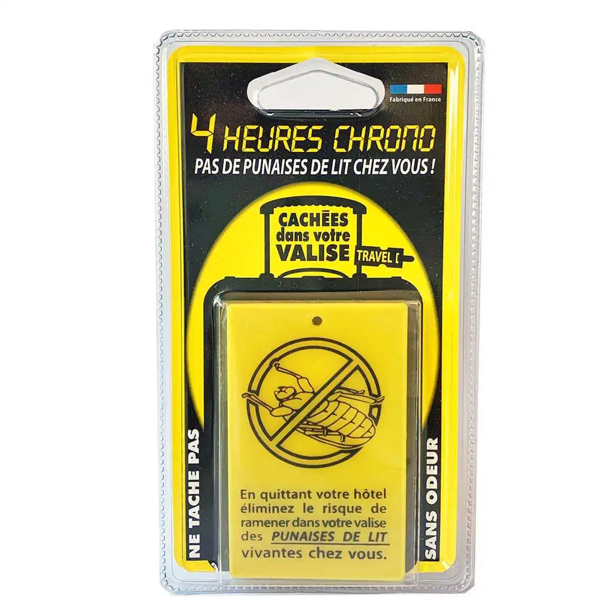 La plaquette 4 HEURES CHRONO est à placer dans votre valise pendant votre séjour pour éliminez le risque de ramener chez vous des punaises de lit cachées dans vos bagages !