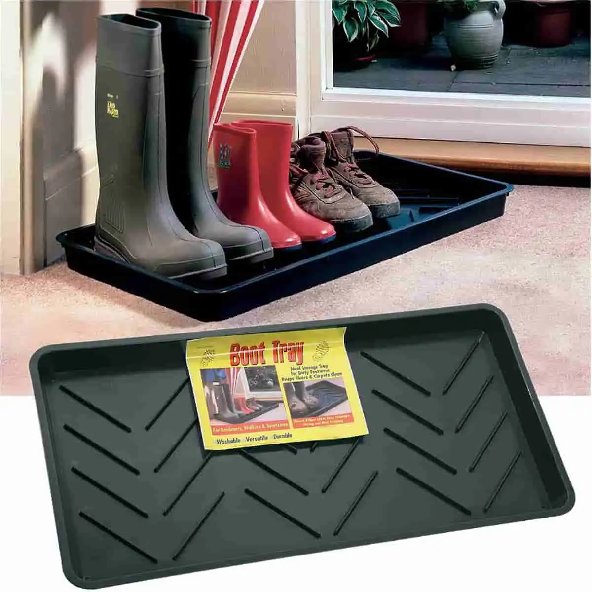 Ce plateau est très large et pratique pour y déposer des bottes boueuses ou des chaussures sales avant de rentrer chez soi. Le plastique noir est assez épais et solide. La qualité est là.