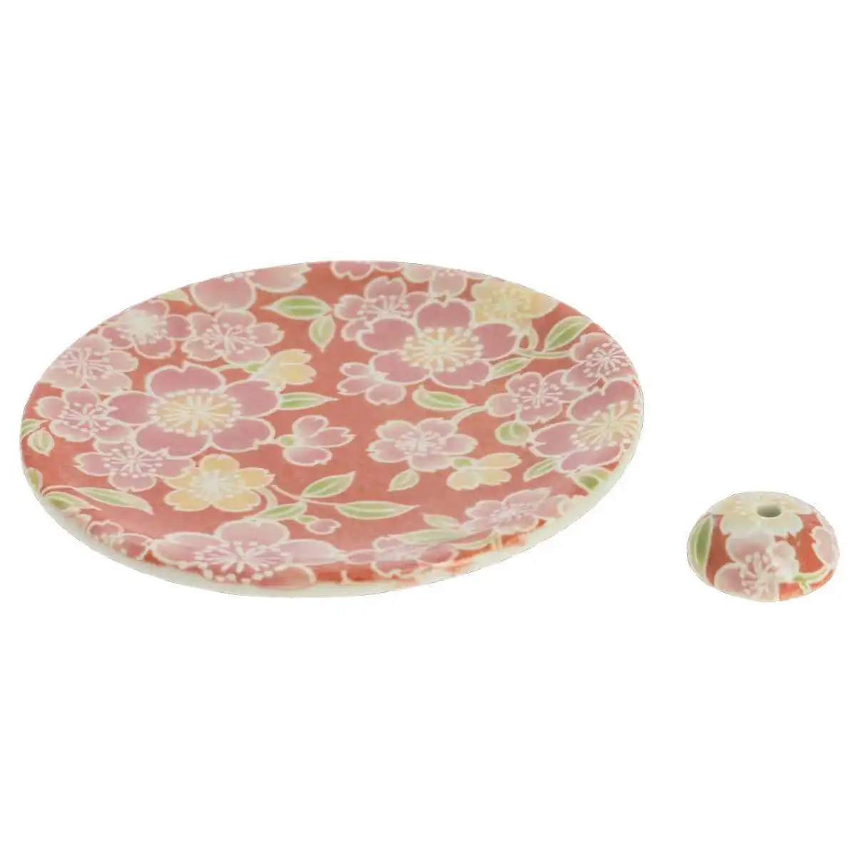 Brûlez votre encens japonais préféré sur ce support en céramique rond aux couleurs douces et florales (rose, orange sanguine, jaune et vert) fabriqué au Japon.