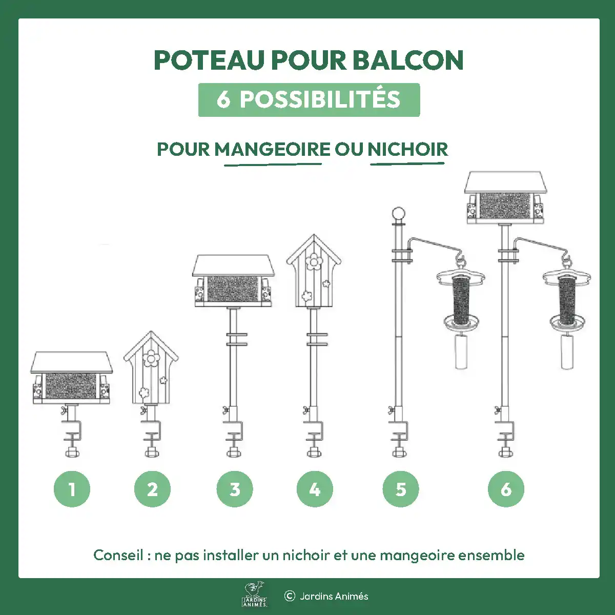 Un seul poteau, trois hauteurs possibles et six configurations au choix pour installer votre mangeoire ou votre nichoir sur la rambarde du balcon.