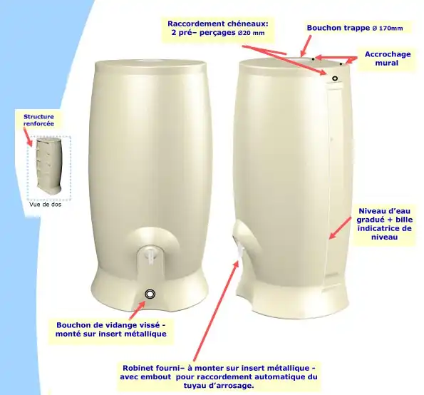 Récupérateur eau de pluie beige très bon produit, discret par la couleur, a passé l'hiver sans problème, bien appréciable pour économiser l'eau et le porte monnaie..