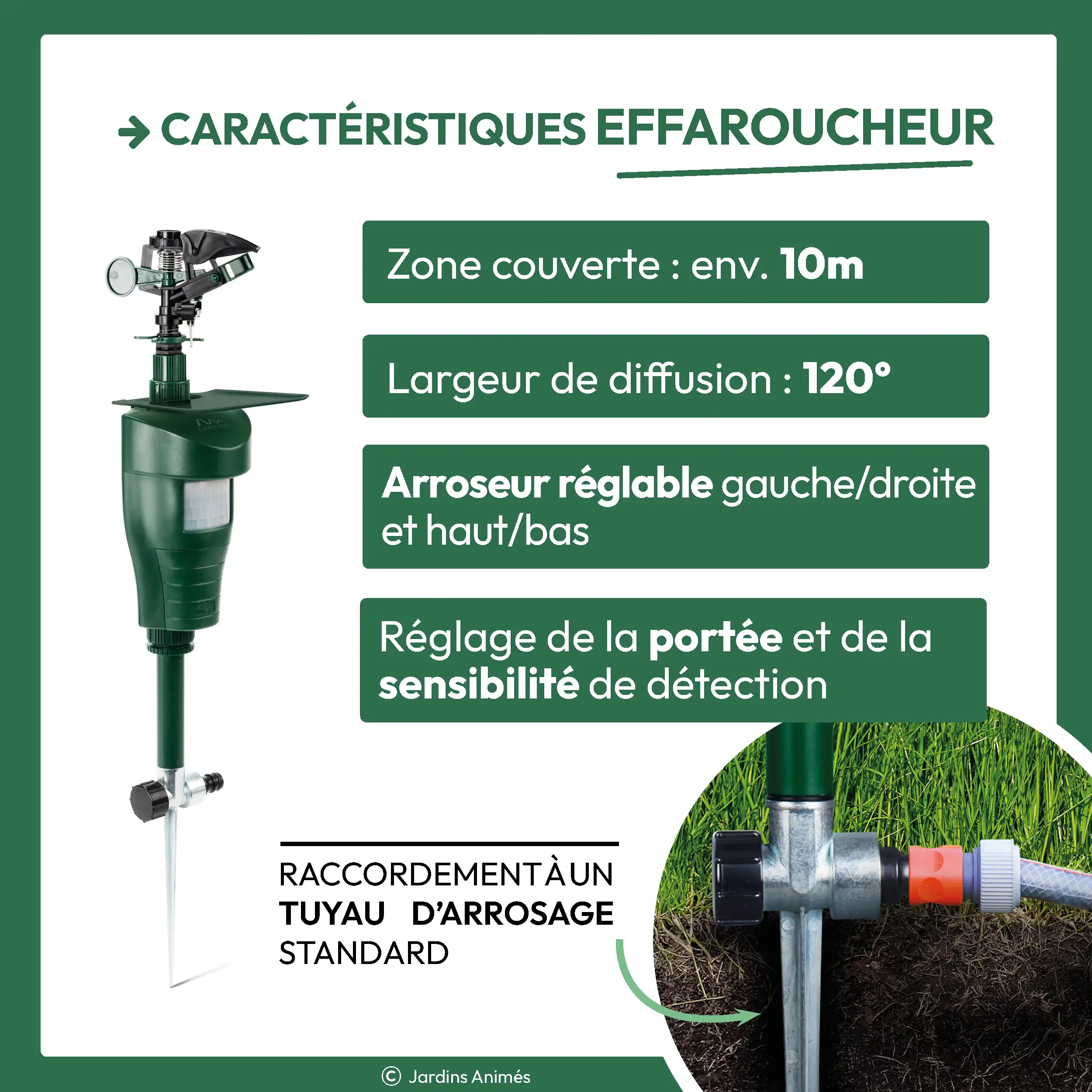 Lorsqu'un animal pénètre dans le champ de détection du capteur de mouvement, un jet d'eau est immédiatement projeté dans sa direction, avec une portée pouvant atteindre jusqu'à 10 mètres. Cette projection soudaine surprend l'animal et déclenche instinctivement sa fuite.