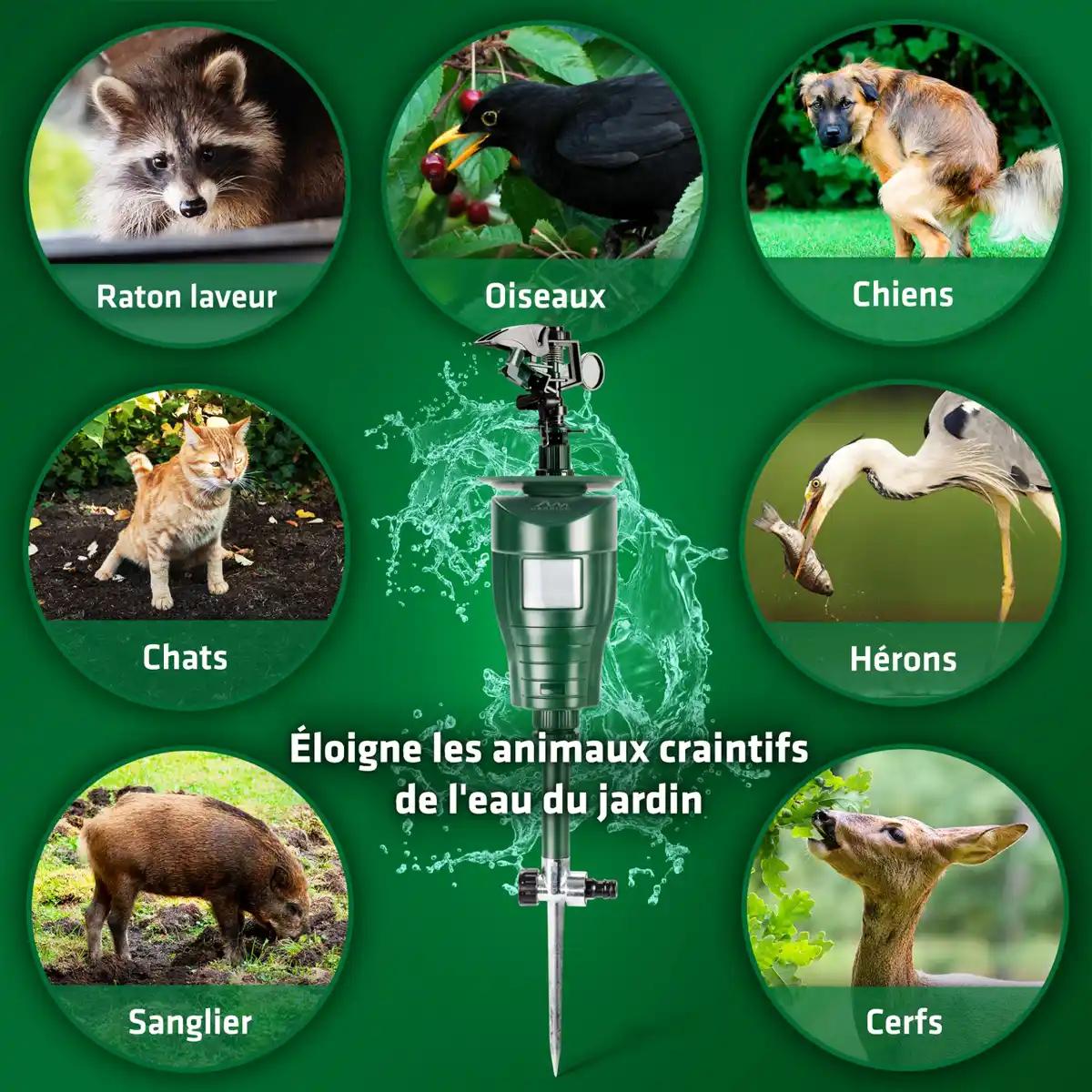 Le répulsif à eau pour animaux constitue une solution écologique et efficace pour éloigner les animaux sensibles à l'eau, tels que les oiseaux, les chiens, les chats, les lièvres et autres nuisibles, des jardins, parterres de fleurs et bassins.