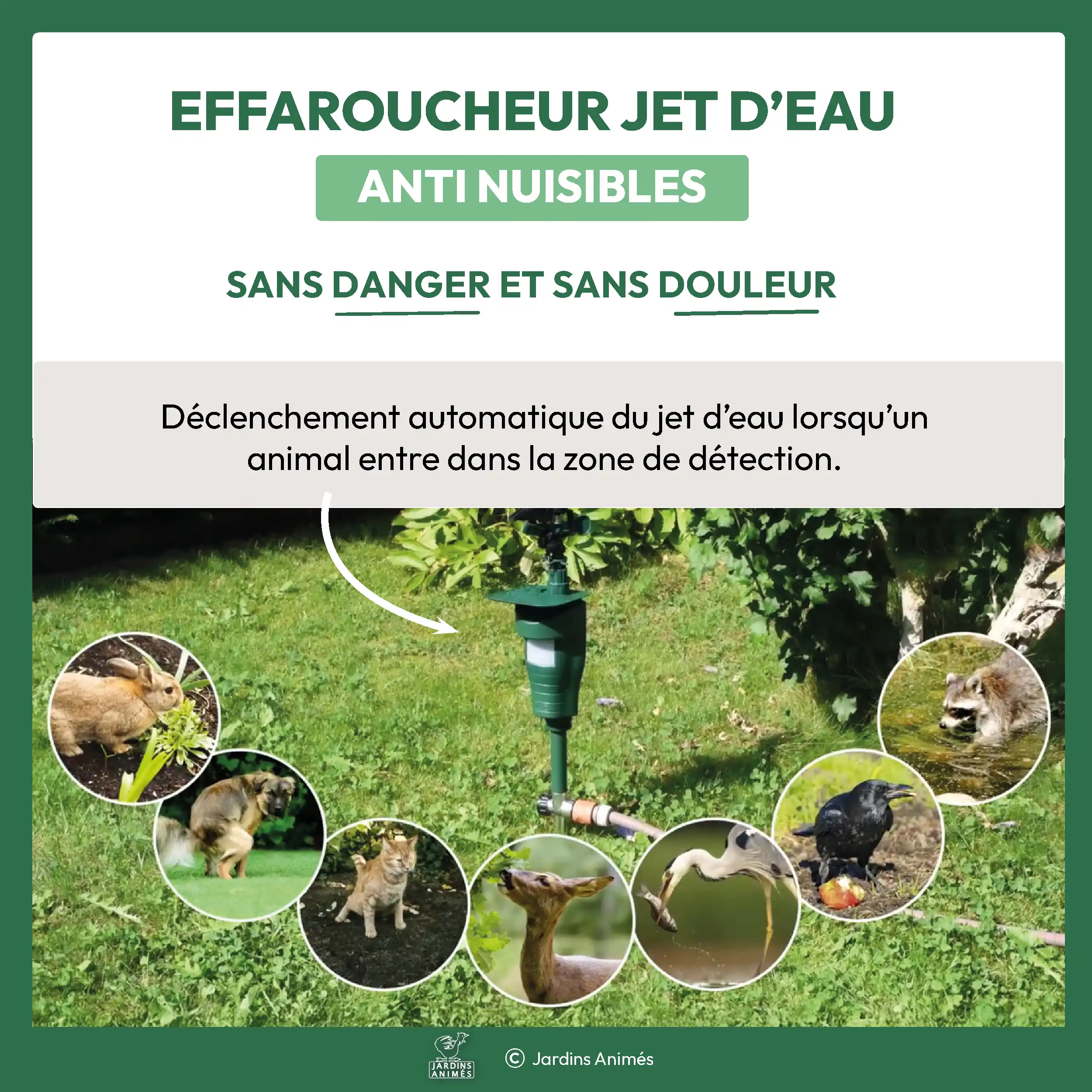 Il s'agit d'une solution non violente pour protéger certaines zones extérieures, sans causer le moindre dommage aux animaux : le jet d'eau se contente de les effrayer afin de stimuler leur instinct de fuite.