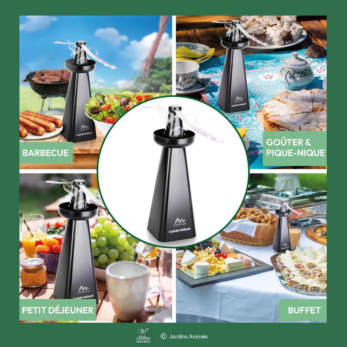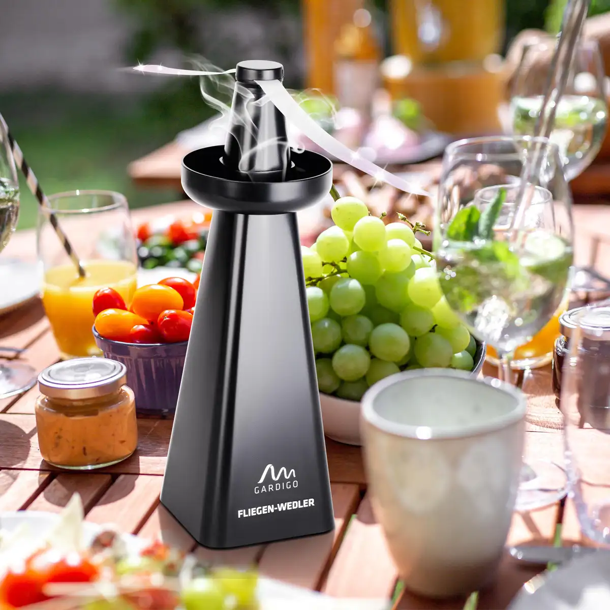 - Le ventilateur crée une double barrière : un flux d'air constant qui perturbe le vol des insectes, combiné aux reflets lumineux scintillants des hélices en rotation qui les désorientent visuellement, formant ainsi une zone protégée invisible autour de la table.