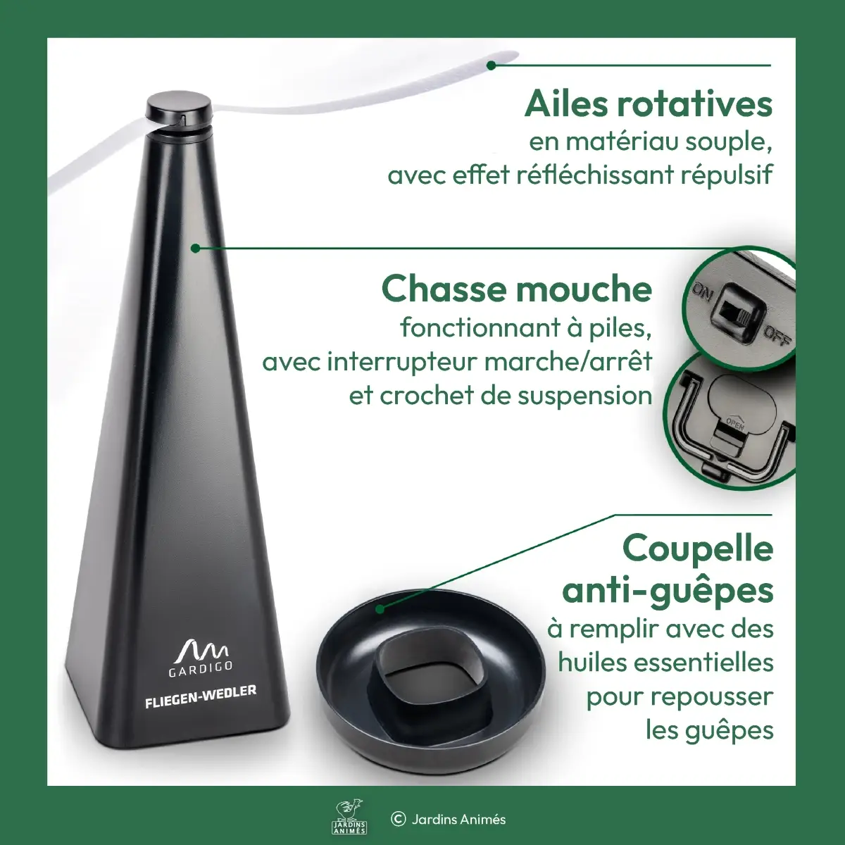 Optez pour ce dispositif innovant, conçu pour repousser efficacement mouches et guêpes grâce à son hélice scintillante. Cet appareil agit sur les insectes nuisibles sans les tuer, offrant ainsi une solution respectueuse et non agressive.