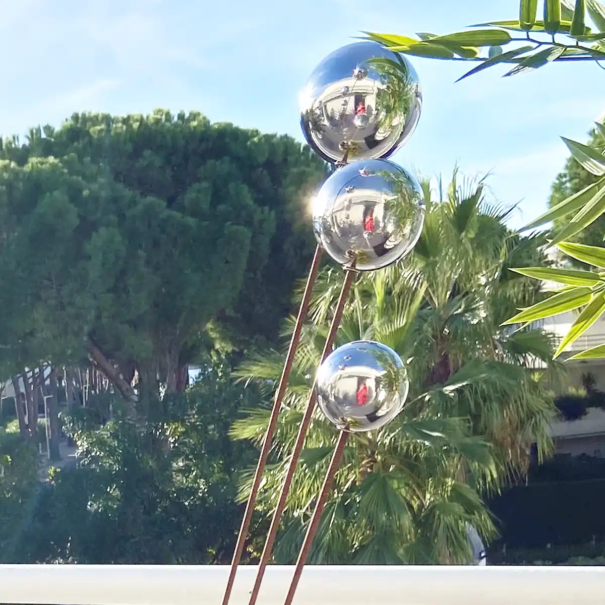 Installée au bout d'une allée, à côté d'un massif de fleurs ou au centre de votre pelouse, cette création attirera tous les regards et apportera du charme à votre extérieur. Grâce à ses sphères éclatantes en inox, elle capte la lumière et réfléchit les couleurs environnantes.