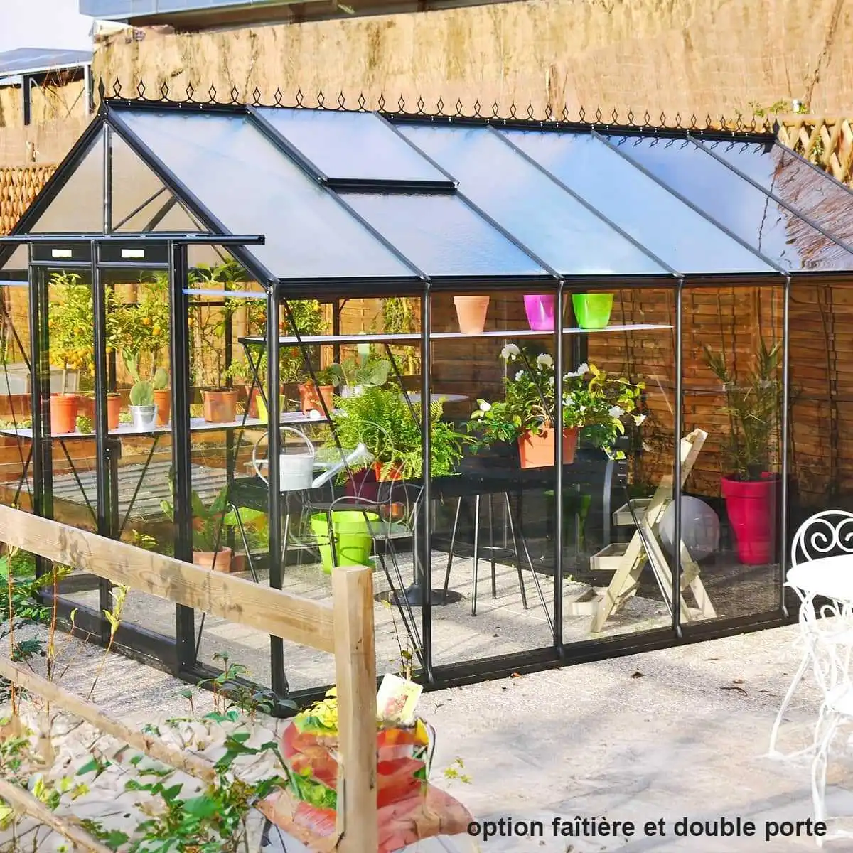 haute, elle qui dépasse le niveau de la gouttière. Cette grande ouverture facilite la passage d'une brouette et le déplacement de vos plantes volumineuses. - Structure en aluminium laquée