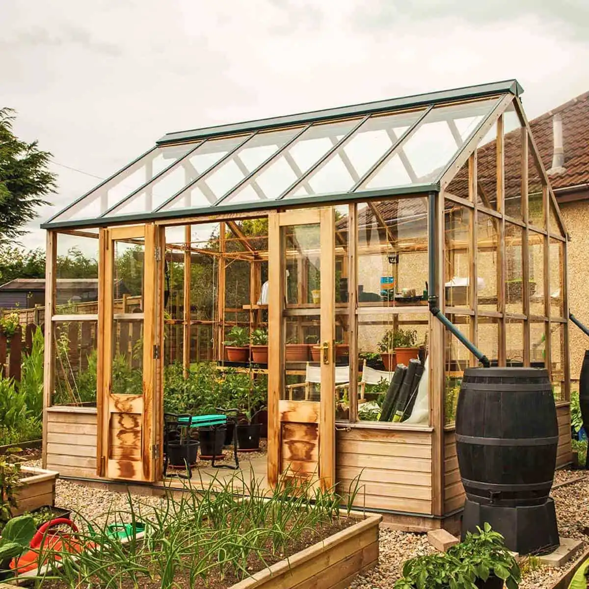 La serre dispose d'un système élégant de gouttières en aluminium. Ajoutez simplement un récupérateur d'eau de pluie pour obtenir une réserve d'eau au plus près de vos besoins, pour l'arrosage des cultures dans la serre.