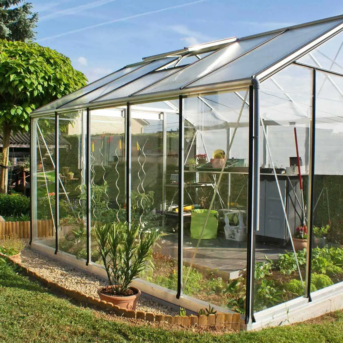 Une serre de taille moyenne, aux dimensions confortables, qui permet la culture de légumes, fruits, herbes aromatiques et plantes en tous genres.
