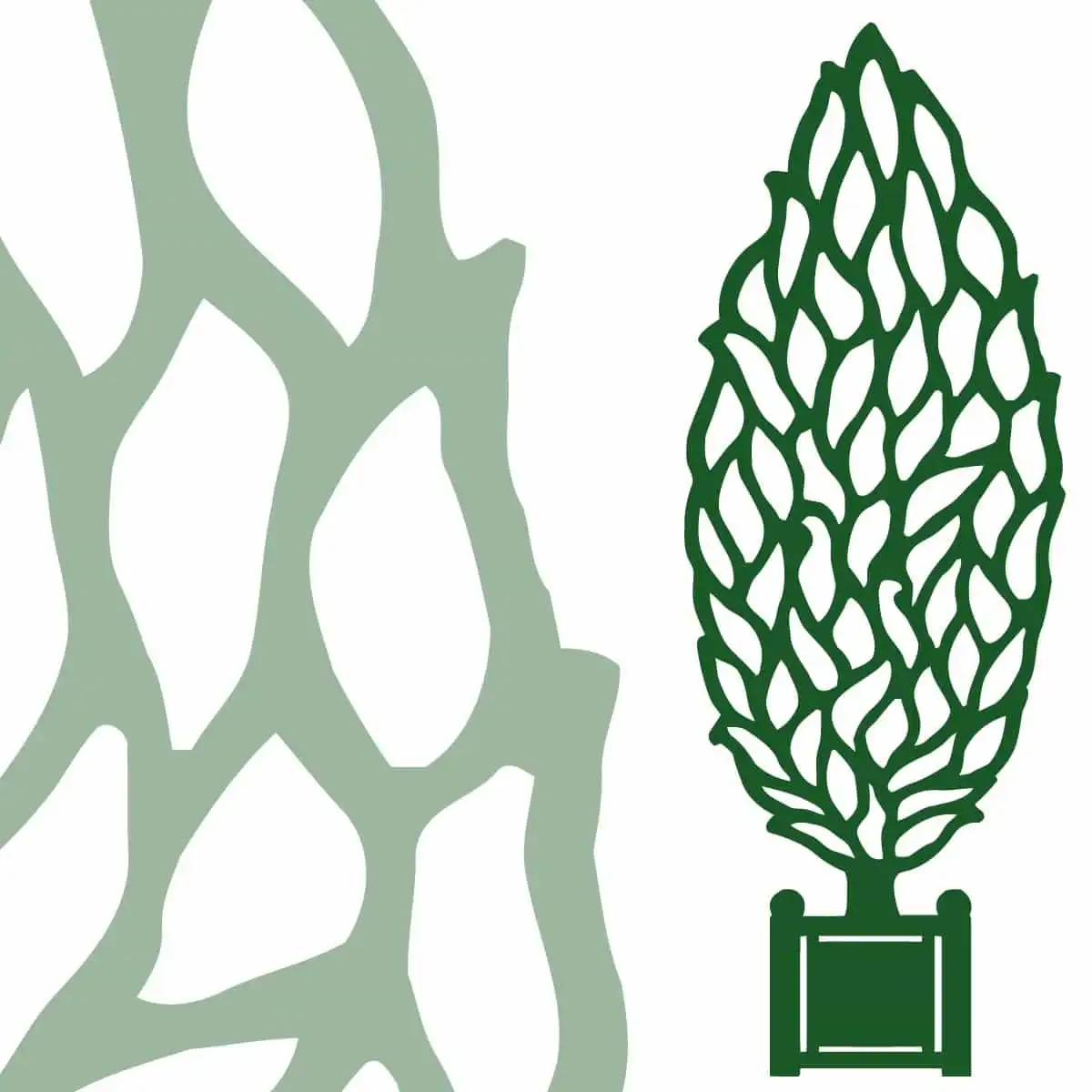 Treillage mural silhouette arbre charme en acier peint vert anglais.