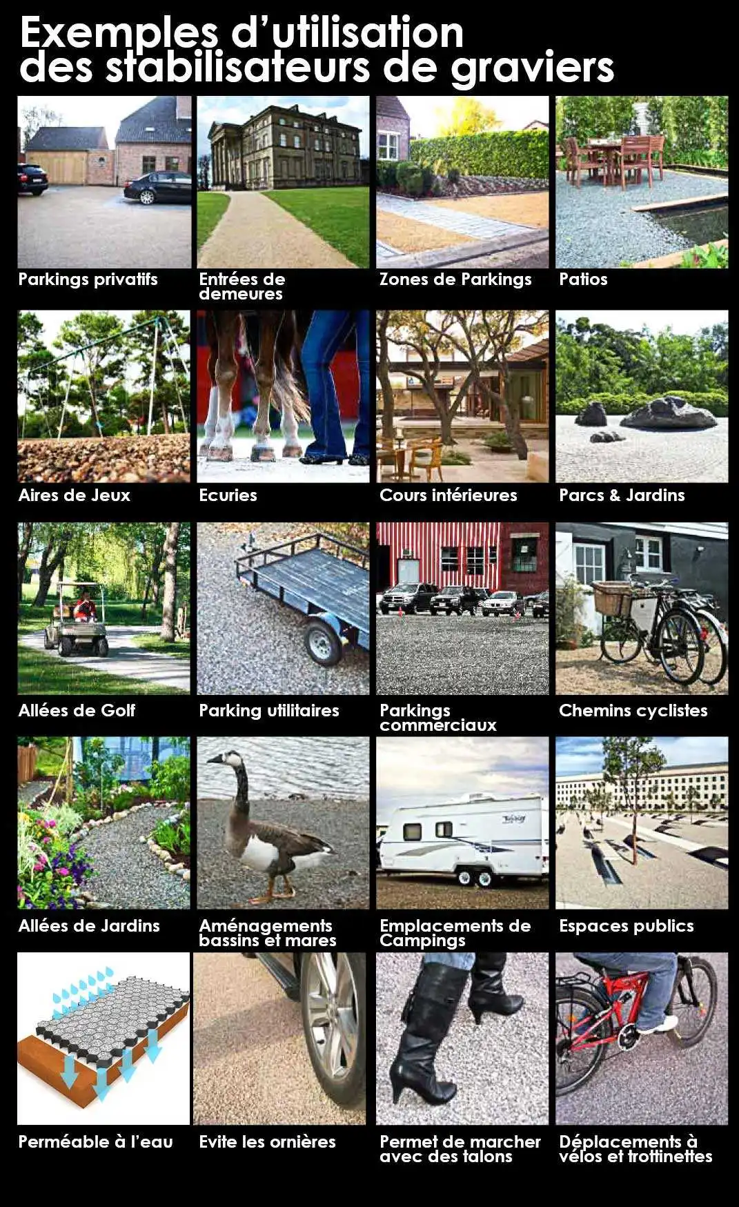 - Un revêtement très praticable : les graviers sont tassés et contenus dans les alvéoles, ils ne s'enfoncent plus. Résultat, vous marchez facilement même avec des chaussures à talons, et tout roule beaucoup mieux : vélos, trottinettes, poussette, fauteuil roulant, voitures, camions