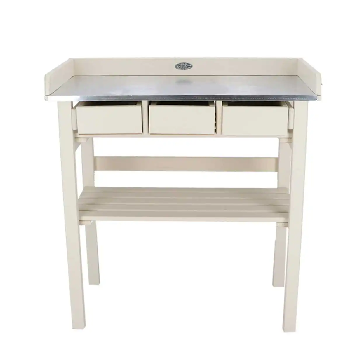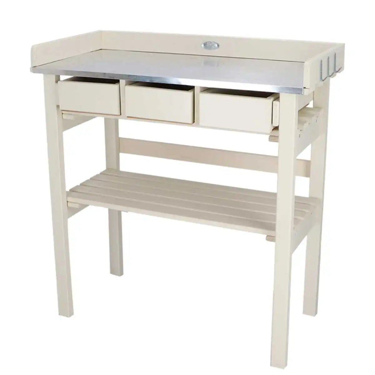 Cette table potagère blanche est munie d'un plan de travail en zinc, un matériau durable et facile à nettoyer.