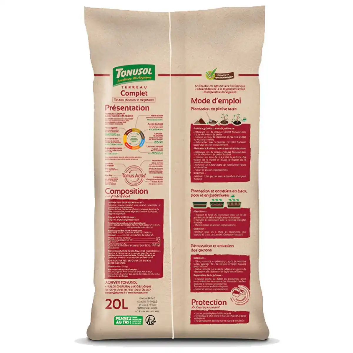 Le Terreau Complet Tonusol est livré prêt à l'emploi en sac de 20 litres. Élaboré avec des matières premières 100% renouvelables, il permet d'économiser 1 arrosage sur 2 au jardin. Il est sans tourbe et décarboné, et enrichi grâce au complexe d'engrais Tonus Activ'.