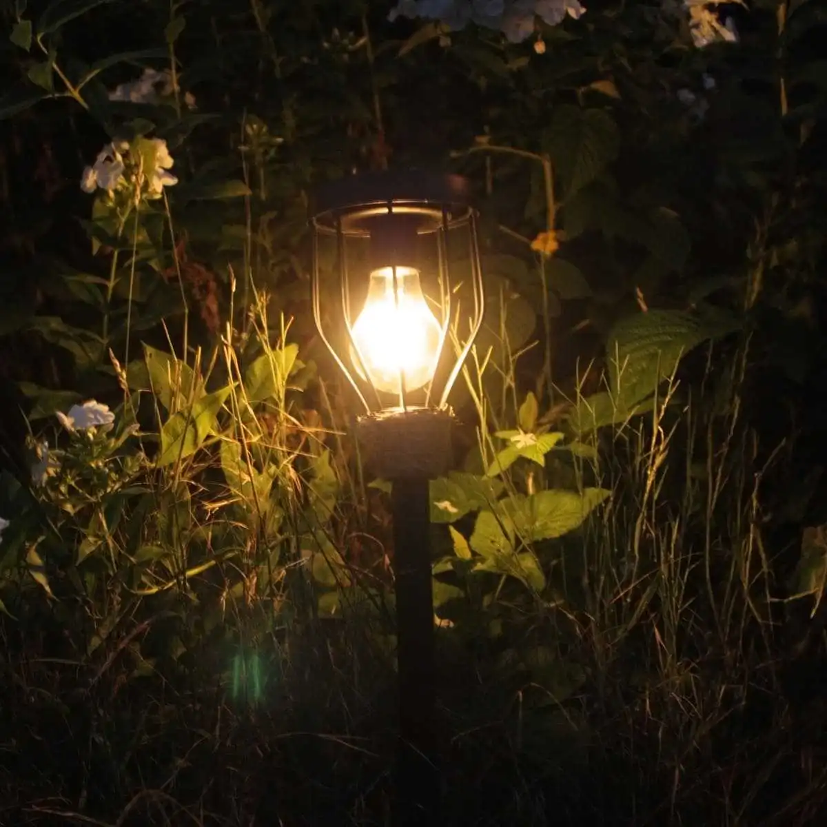 L'ampoule à filament est alimentée par un panneau solaire intégré sur le dessus de la lampe.