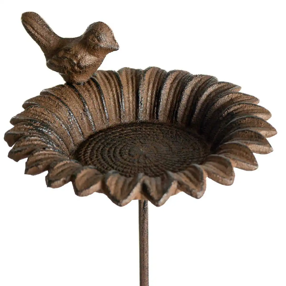 Cette coupelle en fonte est une très jolie mangeoire pour oiseaux. En forme de fleur de tournesol, elle est dotée d'un petit oiseau décoratif lui aussi en fonte.