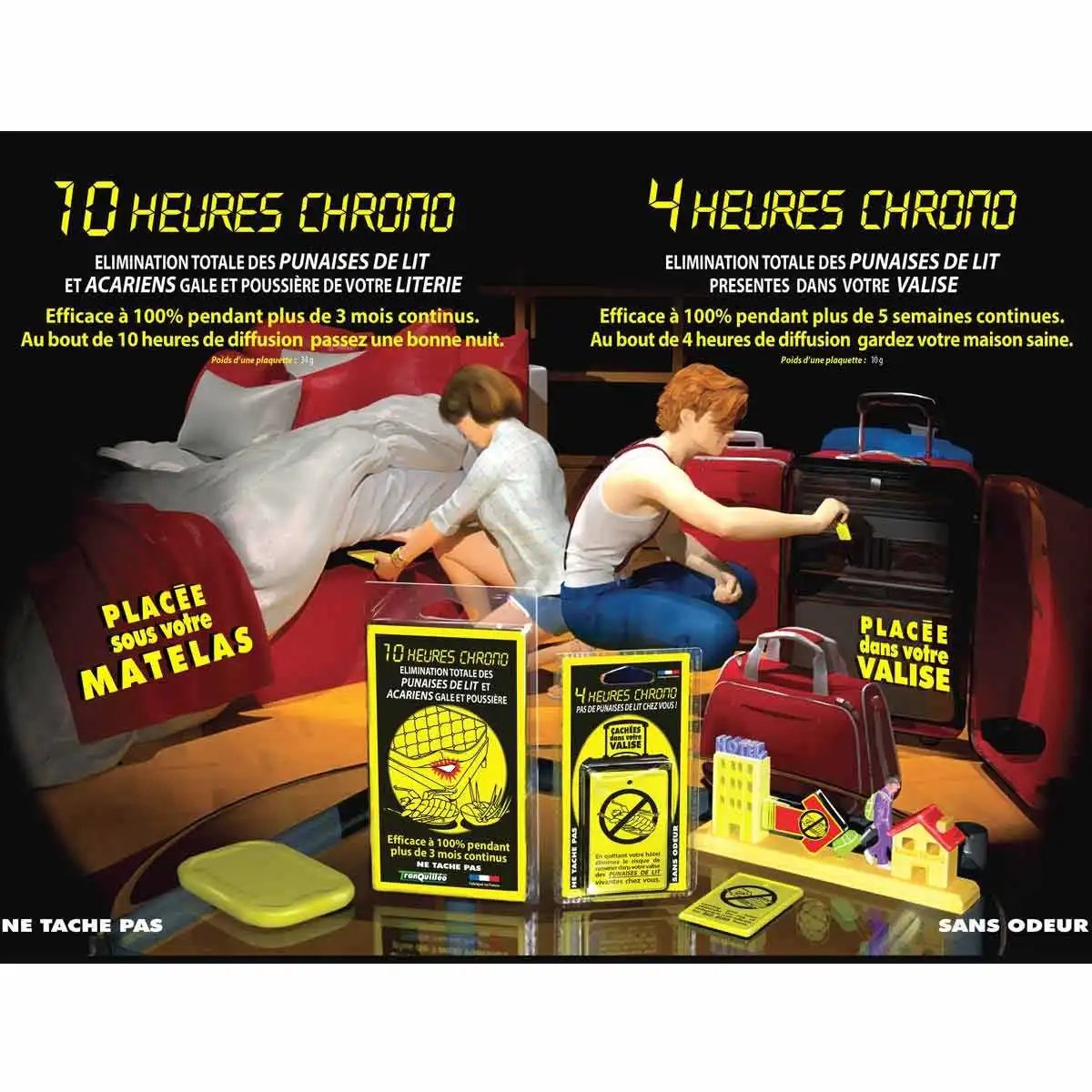 - Les plaquettes 10 HEURES CHRONO : à placer sous votre matelas (à la maison ou à l'hôtel), éradiquez les punaises de votre lit et éliminez le risque de piqûre.