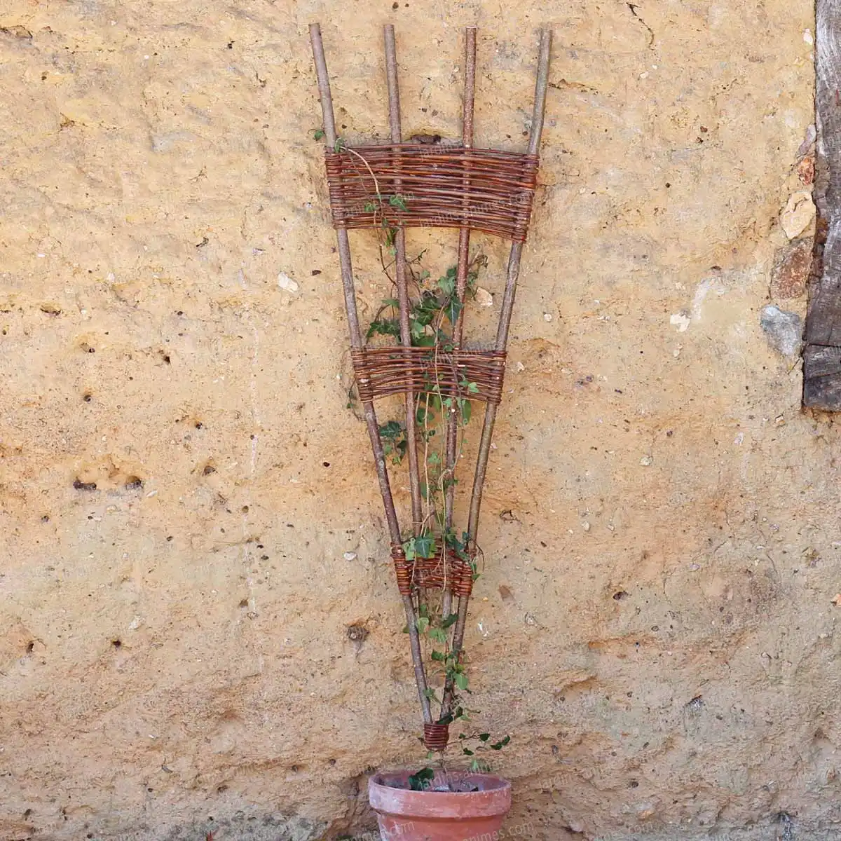Treillis éventail en noisetier tressé d'osier Très satisfaite de ce produit. Je les ai acheté il y a environ 2 ans, ils n'ont pas bougé. J'y fais grimper une clématite et une passiflore (elles s'enroulent seule autour sans problème.) C'est du plus bel effet. Pour l'installation je conseille quand c'est possible de légèrement surélever le treillis pour qu'il ne rentre pas en contact avec le sol : il durera plus longtemps.
