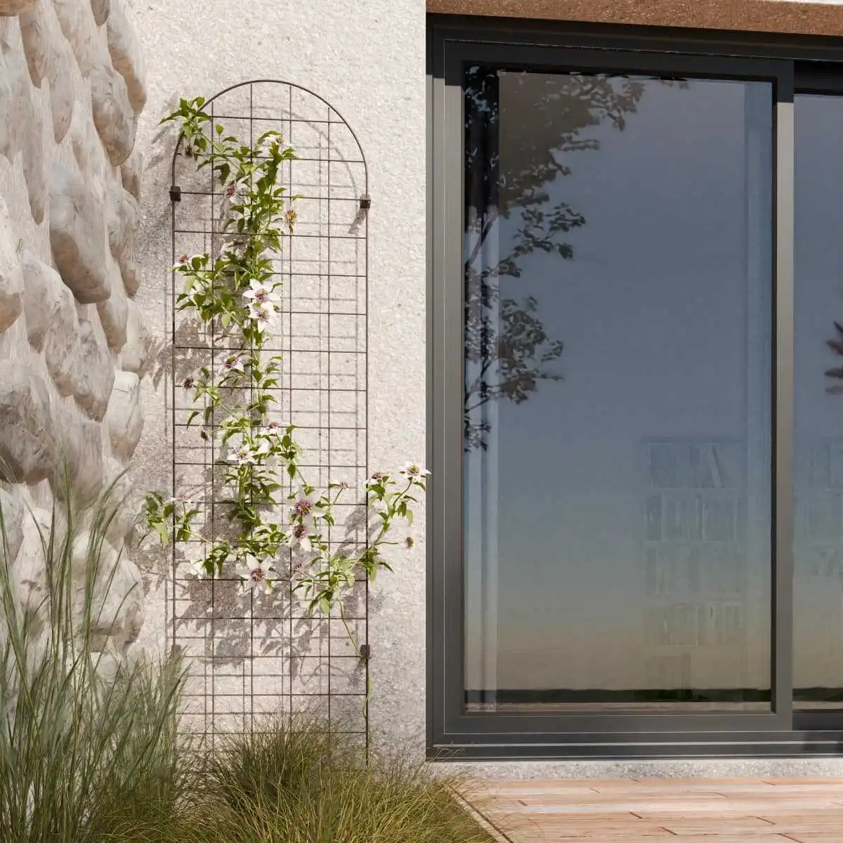Simple et efficace, cette grille arrondie ou rectangulaire se fait discrète et soutient parfaitement tous types de plantes grimpantes parfumées ou persistantes comme le chèvrefeuille, rosier, clématite, passiflore, jasmin, lierre, hortensias…