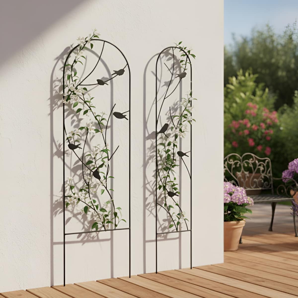 Avec ses fines volutes et ses jolis oiseaux en métal, ce treillis dégage une atmosphère poétique et naturelle. Il apporte une note de charme et de légèreté à votre décoration, tout en mettant en valeur vos plantes grimpantes. Lignes douces et silhouettes d’oiseaux créent un jeu visuel plein de finesse, parfait pour habiller un mur extérieur, une terrasse ou même un mur intérieur. Plus qu’un simple support, c’est un véritable objet déco qui fait entrer un peu de nature et de poésie dans votre quotidien.