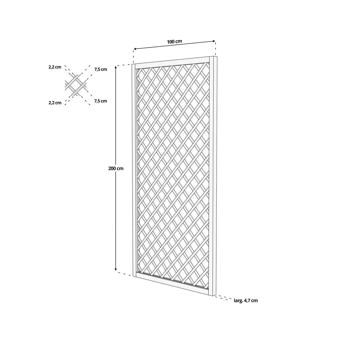 Ce treillis en bois bénéficie d'un cadre renforcé de 4,7cm d'épaisseur. Cela permet de l'utiliser aussi bien comme treillage pour plantes grimpantes que comme brise-vue ou séparation sur un balcon.
