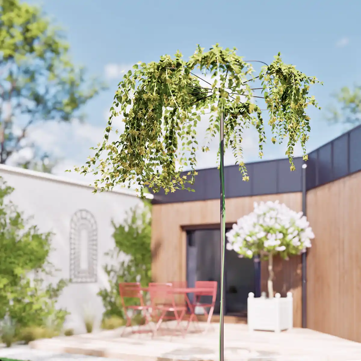 Sa parfaite tenue et une couleur brun/rouille lui donne un coté sculptural qui peut être mise encore plus en avant par l'installation d'autres tuteurs parapluies à proximité. De même diamètre ou du plus grand diamètre, au choix.