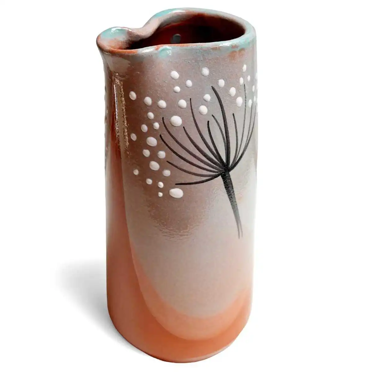 Ce beau vase décoratif est fabriqué en argile rouge par une artisane en Occitanie. D'une hauteur de 18 cm pour 7cm de diamètre, ce vase est entièrement décoré à la main. Son émail lui apporte une légère coloration bleue, sur laquelle est peinte une fleur minimaliste.