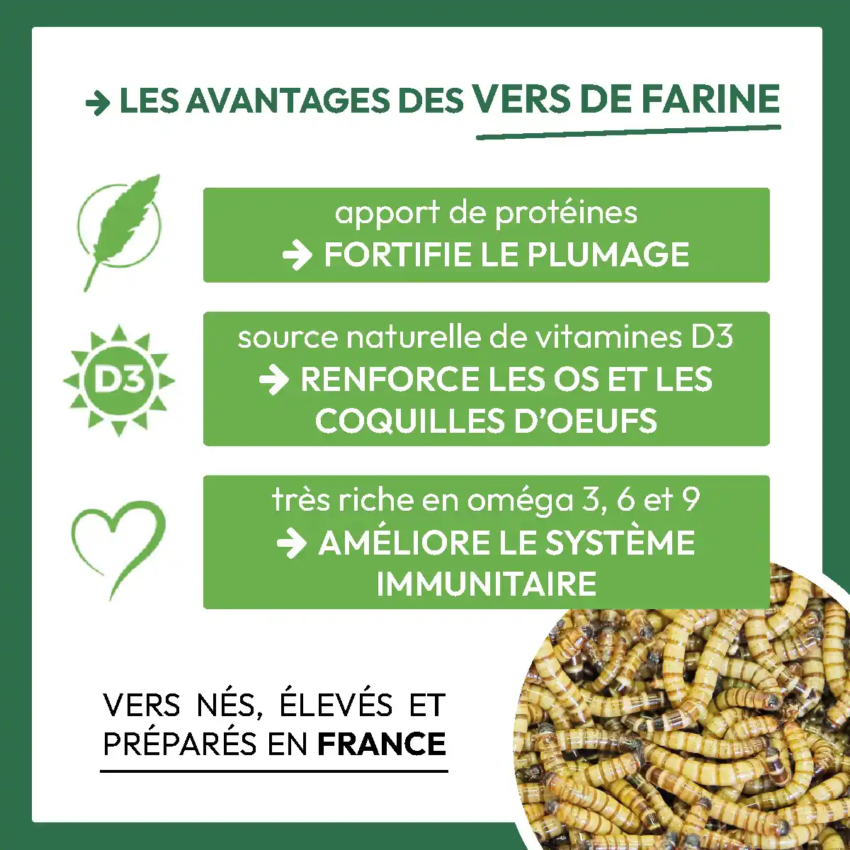 - Spécificité : ces vers sont enrichis naturellement en vitamine D3 grâce à une exposition contrôlée à la lumière